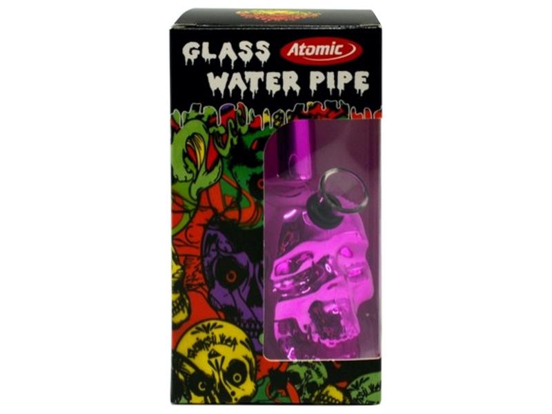 Γυάλινο Bong ATOMIC SKULL 15cm κωδ. 0212883  σε 6 μεταλλικά χρώματα (Μαύρο, ασημί, λαχανί, ροζ, φουξ και μπλε).Έχει ύψος 15cm με στόμιο 40mm και σχέδιο κρανίο. Δέχεται σήτα 2cm (η συσκευασία δεν περιλαμβάνει σήτα).